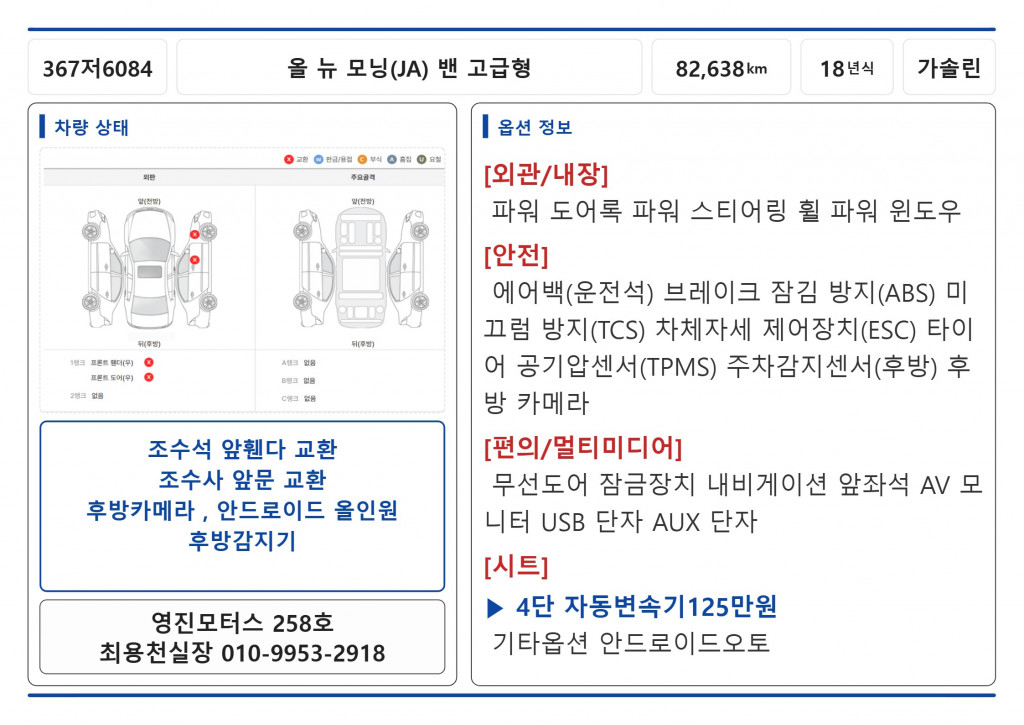 판매가 : 550만원 차량번호 : 367저6084