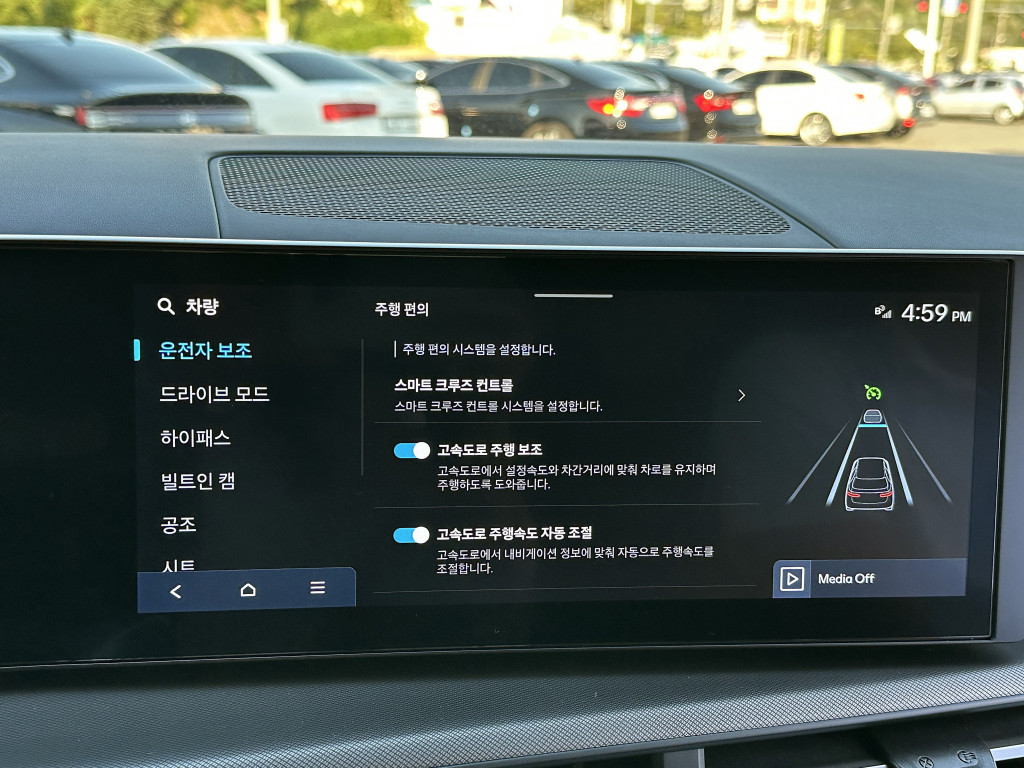 * 스마트크루즈컨트롤, 차선이탈경보시스템, 전방충돌방지보조, 운전자주의경고, 블루링크, 하이패스, 핸들열선,