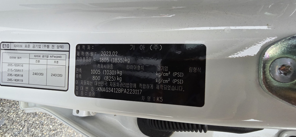 차대번호 | KNAG3412BPA223117 | 성능번호 | 6502102292 |