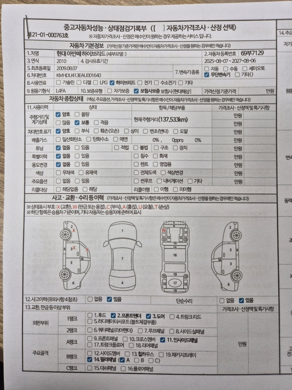사고이력 : 사고유(성능지 참조)